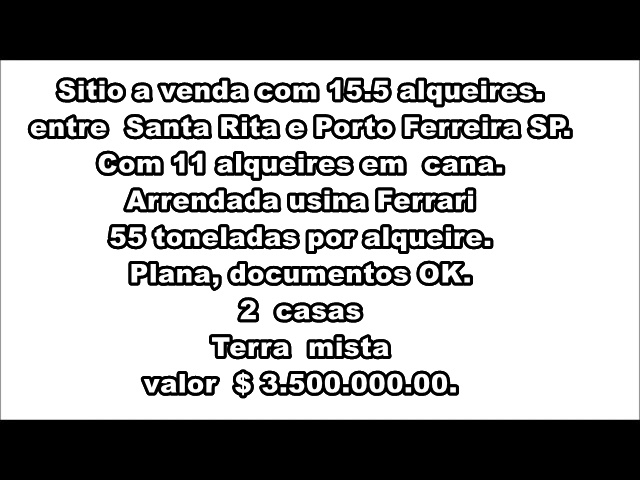 Sitio a venda com 15.5 alqueires. entre Santa Rita e Porto Ferreira SP.